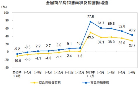 1-6月份,商品房銷售面積51433萬平方米,同比增長28.7%,