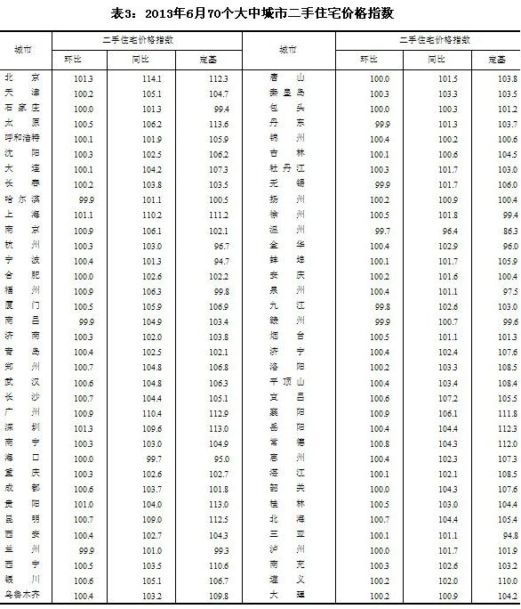 (二)與去年同月相比,70個(gè)大中城市中,價(jià)格下降的城市有2個(gè),上漲的城市有68個(gè)。6月份,同比價(jià)格上漲的城市中,最高漲幅為14.1%,漲幅比5月份回落的城市有11個(gè)。