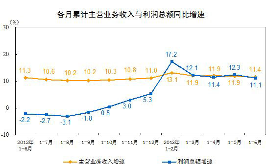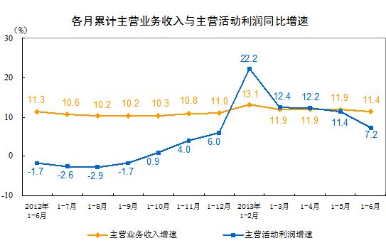 1-6月份,全國(guó)規(guī)模以上工業(yè)企業(yè)實(shí)現(xiàn)利潤(rùn)總額25836.6億元,比去年同期增長(zhǎng)11.1%,增速比1-5月份回落1.2個(gè)百分點(diǎn),其中,主營(yíng)活動(dòng)利潤(rùn)27891.8億元,比去年同期增長(zhǎng)7.2%,增速比1-5月份回落4.2個(gè)百分點(diǎn)。
