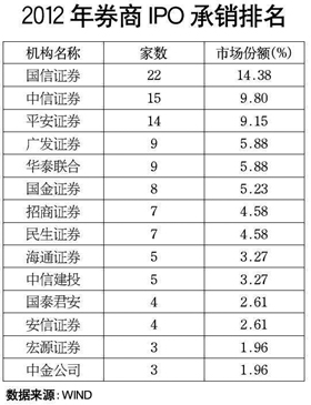 WIND統(tǒng)計數(shù)據(jù)顯示,在IPO保薦項目上,2012年全年,中金公司僅保薦了隆鑫通用、廣汽集團和吉艾科技,合計募集資金13.94億元,位列第17位;實現(xiàn)承銷及保薦費用收入合計1.31億元,位列第11位。其主承銷(首發(fā)、增發(fā)、配股及可轉債)收入合計2.61億元,市場份額為3.78%,位列第9位。而在2005年-2007年期間,憑借著強大的政府背景和在大型項目上突出的業(yè)務實力,當時的中金公司搶下了包括中國神華、中國人壽、建設銀行和工商銀行等許多大型項目的IPO,也為公司帶來了不菲的保薦和承銷費用。即使在2009年,中金公司也以10.9億元摘取承銷收入第一的桂冠,市場份額為20.64%。2010年,隨著創(chuàng)業(yè)板的推出,中金公司在IPO承銷市場一落千丈,承銷收入縮水至7億元,市場份額為4.13%;2011年,中金公司業(yè)績再度縮水,IPO承銷收入降至1.68億元,市場份額下滑到1.27%。