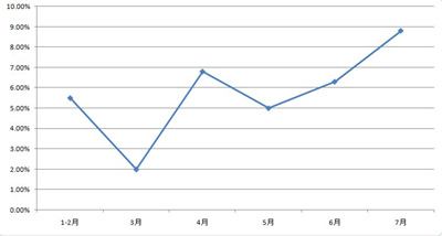 數(shù)據(jù)顯示,7月份工業(yè)用電量同比增長(zhǎng)8.1%,比6月份回升了2.41個(gè)百分點(diǎn)。其中重工業(yè)用電量繼續(xù)企穩(wěn)回升,同比增長(zhǎng)7.7%。據(jù)記者了解,除了化工用電量增幅下降1個(gè)百分點(diǎn)之外,有色等其他三大高耗能行業(yè)用電量增幅均有所回升,其中建材產(chǎn)業(yè)和黑色金屬產(chǎn)業(yè)分別回升了3.7個(gè)百分點(diǎn)和2.5個(gè)百分點(diǎn)至3.7%和2.5%。而輕工業(yè)用電量情況也出現(xiàn)好轉(zhuǎn),同比增幅從6月份的4.33%上升至7月份的10%。
