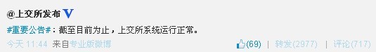 上交所官方微博上午(11:44)表示,截至目前為止,上交所系統(tǒng)運(yùn)行正常。