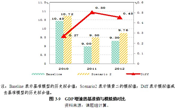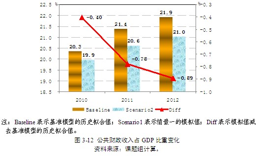 第三,得益于居民消費需求的擴大以及經(jīng)濟增長的加快,企業(yè)自籌投資增速相較基準(zhǔn)模擬水平也有所提高。同時,稅收收入增速也逐漸加快。與基準(zhǔn)模型的歷史擬合值相比,在2010-2012年期間,稅收收入增速先降低3.98百分點,之后提高1.12、0.78個百分點(圖3-11)。財政總收入占GDP的比重分別下降0.4、0.78和0.89個百分點(圖3-12)。