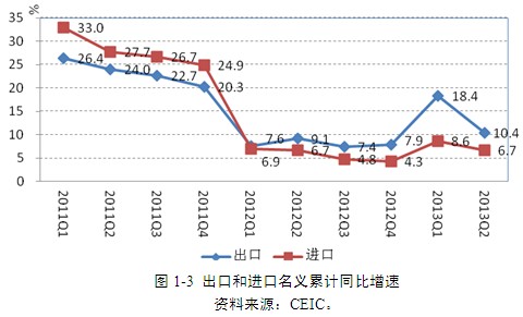 2013年上半年主要經(jīng)濟(jì)體需求疲軟、人民幣持續(xù)升值以及工資的提高導(dǎo)致中國進(jìn)出口增長乏力。上半年按美元計(jì)的出口總額增長10.4%,僅比上年同期增加了1.3個(gè)百分點(diǎn);進(jìn)口總額增長6.7%,與上年同期持平(圖1-3)。貿(mào)易順差累計(jì)1079.5億美元,同比增加了57.4%。上半年實(shí)際利用外商直接投資增長4.8%,比上年同期上升了7.8個(gè)百分點(diǎn);新增外匯儲(chǔ)備為1851億美元。