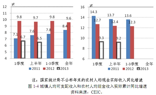2013年上半年,城鎮(zhèn)居民人均可支配收入為13649元,扣除價(jià)格變化后實(shí)際增長6.5%,低于同期的經(jīng)濟(jì)增長率;比2011年同期下降了1.1個(gè)百分點(diǎn),比2012年同期下降了3.2個(gè)百分點(diǎn)。上半年農(nóng)村人均現(xiàn)金收入4817元,扣除價(jià)格變化后實(shí)際增長9.2%;比2011年同期下降了4.5個(gè)百分點(diǎn),比2012年同期下降3.2個(gè)百分點(diǎn)(圖1-4)。城鄉(xiāng)居民實(shí)際收入增速的大幅下滑從根本上抑制了居民消費(fèi)需求擴(kuò)張。