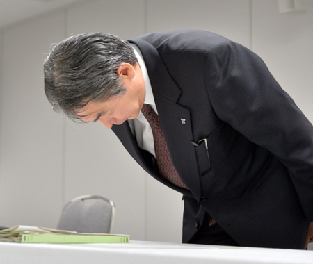 下圖為21日東京電力公司執(zhí)行副總裁Bungo Aizawa在公司總部舉行的新聞發(fā)布會上鞠躬!》ㄐ律