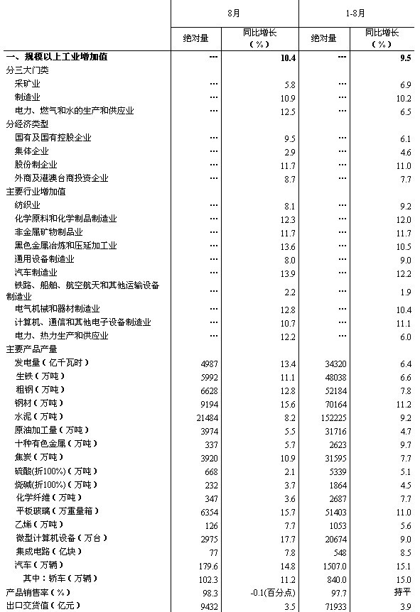 分行業(yè)看,8月份,41個大類行業(yè)中有39個行業(yè)增加值保持同比增長。其中,紡織業(yè)增長8.1%,化學原料和化學制品制造業(yè)增長12.3%,非金屬礦物制品業(yè)增長11.7%,黑色金屬冶煉和壓延加工業(yè)增長13.6%,通用設備制造業(yè)增長8.0%,汽車制造業(yè)增長13.9%,鐵路、船舶、航空航天和其他運輸設備制造業(yè)增長2.2%,電氣機械和器材制造業(yè)增長12.8%,計算機、通信和其他電子設備制造業(yè)增長10.7%,電力、熱力的生產(chǎn)和供應業(yè)增長12.2%。