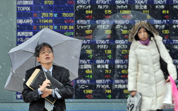 圖為日本首都東京街頭,人們走過股市信息顯示牌。 新華/法新 |