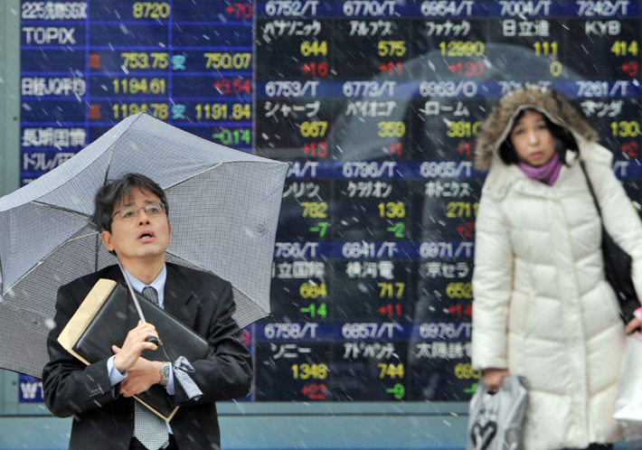 圖為日本首都東京街頭,人們走過股市信息顯示牌。新華/法新