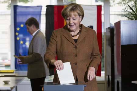 9月22日,在德國(guó)柏林一投票站,德國(guó)總理默克爾參加投票。