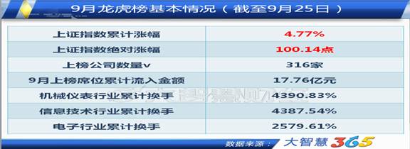 據(jù)大智慧統(tǒng)計數(shù)據(jù)顯示,截至9月25日,龍虎榜的上榜家數(shù)共有316家,資金凈流入17.76億元。表現(xiàn)最為活躍的3個行業(yè)仍然是機械儀表行業(yè)、信息技術(shù)行業(yè)和電子行業(yè),累計換手率分別達(dá)到了4390.83%、4387.54%以及2579.61%。這3個行業(yè)在7月和8月龍虎榜中也是表現(xiàn)最為活躍,涌現(xiàn)出多只漲勢凌厲的個股。在最活躍的機械儀表行業(yè)里面,換手率排名靠前的個股分別是戴維醫(yī)療(282.45%)、三維絲(238.51%)、桑樂金(214.03%)、博林特(203.85%)和江蘇宏寶(194.74%)。這幾只股票在9月都取得了不錯的漲幅。