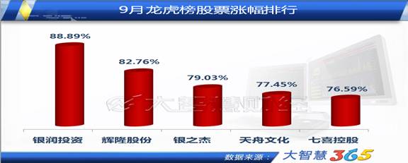 9月龍虎榜股票漲幅排行榜也驗證了這一點。以88.89%的漲幅排名第一的銀潤投資為重組概念股,漲幅第2的輝隆股份和漲幅第4的天舟文化,為土改概念股和文化傳媒股。大智慧投資顧問余磊表示,在經(jīng)過暑期檔多部電影創(chuàng)下過億票房后,文化傳媒股的三季報或能有優(yōu)異表現(xiàn),屆時或又將迎來一番炒作。