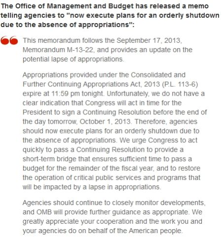 因美國(guó)兩黨就奧巴馬醫(yī)改分歧仍舊無(wú)法彌合,國(guó)會(huì)兩院沒(méi)有就新預(yù)算案達(dá)成一致,美國(guó)政府管理預(yù)算局(Office of Management and Budge)于周一午夜(北京時(shí)間臨近周二中午)發(fā)布備忘錄,要求各部門(mén)開(kāi)始執(zhí)行有序關(guān)閉計(jì)劃。