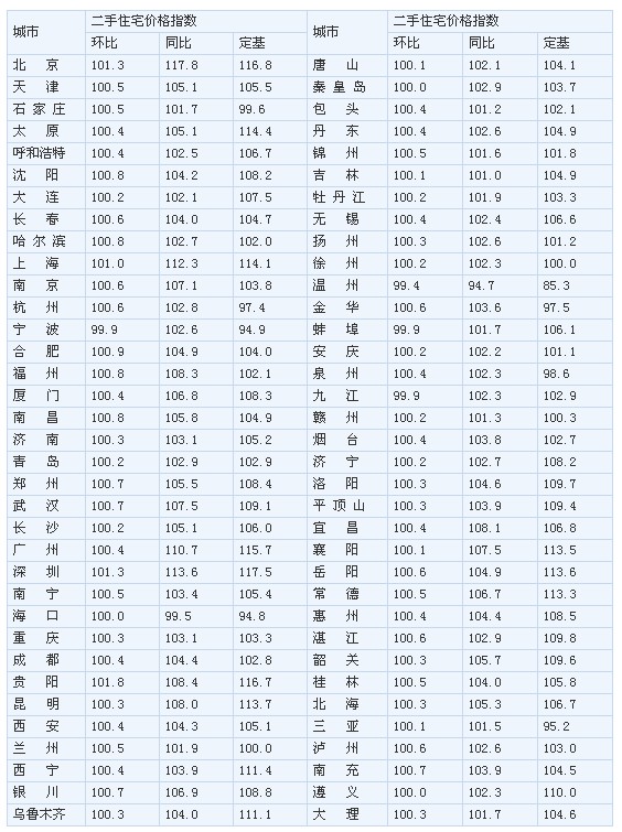 表3:2013年9月70個(gè)大中城市二手住宅價(jià)格指數(shù)