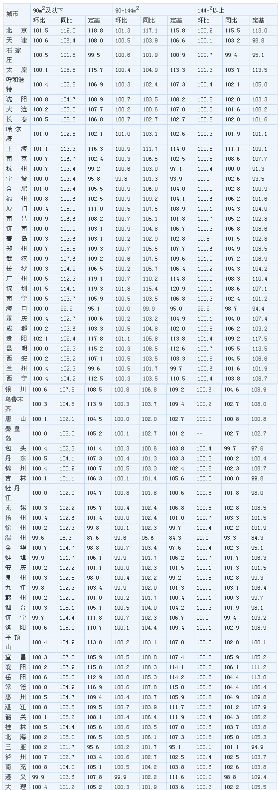 3、調(diào)查方法。70個(gè)大中城市的新建住宅銷售價(jià)格、面積、金額等資料直接采用當(dāng)?shù)胤康禺a(chǎn)管理部門的網(wǎng)簽數(shù)據(jù)。二手住宅銷售價(jià)格調(diào)查為非全面調(diào)查,采用重點(diǎn)調(diào)查和典型調(diào)查相結(jié)合的方法,按照房地產(chǎn)經(jīng)紀(jì)機(jī)構(gòu)上報(bào)、房地產(chǎn)管理部門提供與調(diào)查員實(shí)地采價(jià)相結(jié)合的方式收集基礎(chǔ)數(shù)據(jù)。