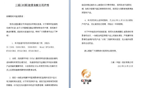在過去的兩天時(shí)間里,央視財(cái)經(jīng)頻道《經(jīng)濟(jì)半小時(shí)》欄目連續(xù)播出了三星部分型號手機(jī),涉嫌設(shè)計(jì)缺陷導(dǎo)致頻繁死機(jī),以及三星公司在維修售后服務(wù)環(huán)節(jié),對中國消費(fèi)者進(jìn)行不公正待遇的報(bào)道,節(jié)目播出后,引起了社會(huì)各界的巨大反響,今天下午三點(diǎn)半,三星公司正式通過央視財(cái)經(jīng)頻道向中國消費(fèi)者的致歉及企業(yè)整改聲明。