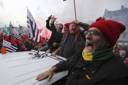 當(dāng)?shù)貢r間11月2日,在法國布列塔尼地區(qū)菲尼斯泰爾省省會坎佩爾,人們戴著抗稅斗爭象征的紅色便帽參加示威游行,抗議政府計劃開征“環(huán)保稅”,要求就業(yè)權(quán)。這個稅種由上屆薩科齊政府主張制定,原定于明年1月1日實施。法國總理埃羅當(dāng)日呼吁民眾不要使用暴力手段來解決該地區(qū)面臨的失業(yè)、經(jīng)濟蕭條和引發(fā)爭議的“環(huán)保稅”等問題,表示政府將繼續(xù)與民意代表以及經(jīng)濟界人士對話,尋求該地區(qū)發(fā)展之道。