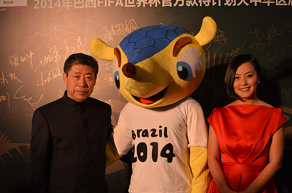 國際足聯(lián)執(zhí)委張吉龍先生(左)、盛開國際體育董事長李紅女士(右)與巴西世界杯吉祥物人偶在啟動儀式上合影。