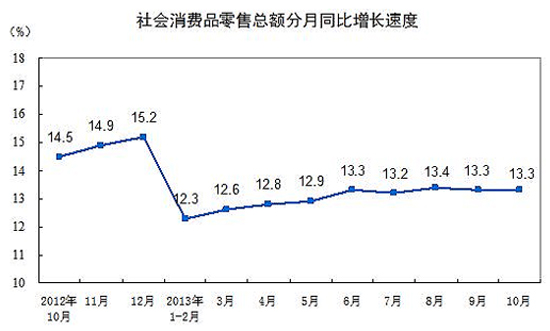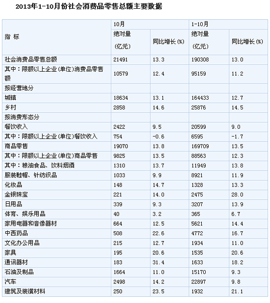 2013年10月份,社會消費(fèi)品零售總額21491億元,同比名義增長13.3%(扣除價(jià)格因素實(shí)際增長11.2%,以下除特殊說明外均為名義增長)。其中,限額以上企業(yè)(單位)消費(fèi)品零售額10579億元,增長12.4%。1-10月份,社會消費(fèi)品零售總額190308億元,同比增長13.0%。