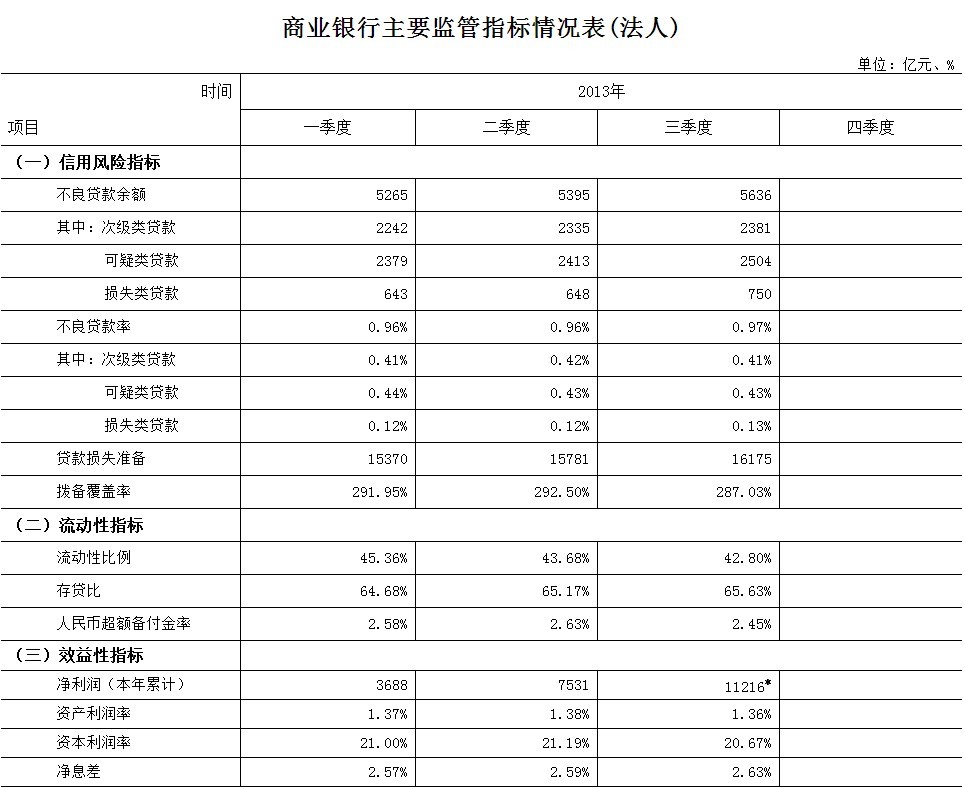銀監(jiān)會(huì)網(wǎng)站13日消息,2013年第三季度末商業(yè)銀行不良貸款總額5636億元,不良貸款率為0.97%。其中農(nóng)村商業(yè)銀行不良貸款率最高,達(dá)1.62%。