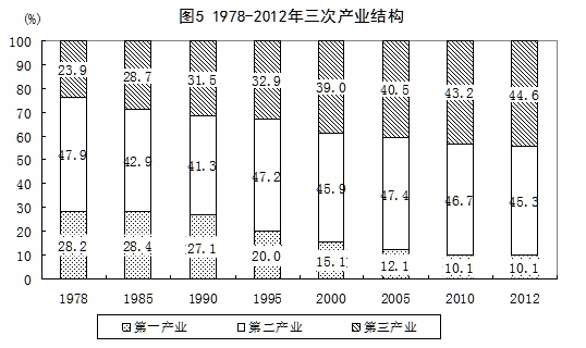 產(chǎn)業(yè)結(jié)構(gòu)不斷優(yōu)化。35年來,三次產(chǎn)業(yè)在調(diào)整中均得到長足發(fā)展,農(nóng)業(yè)基礎(chǔ)地位不斷強化,工業(yè)實現(xiàn)持續(xù)快速發(fā)展,服務(wù)業(yè)迅速發(fā)展壯大。1979-2012年,第一、二、三產(chǎn)業(yè)增加值年均實際分別增長4.6%、11.3%和10.8%。三次產(chǎn)業(yè)增加值在國內(nèi)生產(chǎn)總值中所占的比例由1978年的28.2:47.9:23.9調(diào)整為2012年的10.1:45.3:44.6。與1978年相比,2012年第一產(chǎn)業(yè)比重下降18.1個百分點,第二產(chǎn)業(yè)比重下降2.6個百分點,第三產(chǎn)業(yè)比重大幅上升20.7個百分點。