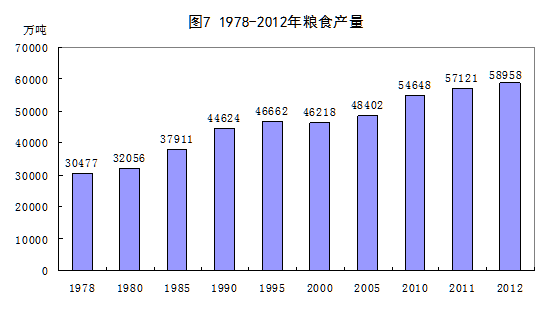 農(nóng)產(chǎn)品供給不僅解決了占世界五分之一人口的溫飽問題,還為工業(yè)化快速推進(jìn)提供了重要支撐。35年來,黨中央、國務(wù)院始終把農(nóng)業(yè)生產(chǎn)放在十分重要的戰(zhàn)略地位,千方百計促進(jìn)農(nóng)業(yè)生產(chǎn),穩(wěn)定糧食產(chǎn)量,不僅成功解決了中國人的溫飽問題,實現(xiàn)了人民生活水平質(zhì)的提高,而且為工業(yè)發(fā)展提供了豐富的原料。2012年,糧食產(chǎn)量達(dá)到58958萬噸,比1978年增長93.5%,2004年以來實現(xiàn)“九連增”,連續(xù)6年穩(wěn)定在5億噸以上的水平;棉花產(chǎn)量684萬噸,比1978年增長2.2倍;油料產(chǎn)量3437萬噸,增長5.6倍;糖料產(chǎn)量13485萬噸,增長4.7倍;水果產(chǎn)量24057萬噸,增長35.6倍;水產(chǎn)品產(chǎn)量5908萬噸,增長11.7倍。肉類產(chǎn)量8387萬噸,比1979年增長6.9倍。2011年,谷物、肉類、籽棉、花生、茶葉、水果產(chǎn)量穩(wěn)居世界第一位,油菜籽、甘蔗、大豆分列第二、三、四位。從人均水平看,2012年人均糧食產(chǎn)量達(dá)到436.5公斤,比1978年增長36.9%;人均棉花、油料、糖料、水產(chǎn)品產(chǎn)量分別達(dá)到5.1公斤、25.4公斤、99.8公斤和43.7公斤,分別增長1.2倍、3.7倍、3.0倍和8.0倍。