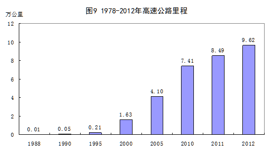 交通運輸設(shè)施日益完善。35年來,我國交通網(wǎng)絡(luò)不斷完善,運輸能力不斷增強,運輸效率不斷提高,有力地支撐了各項產(chǎn)業(yè)的發(fā)展。2012年,我國鐵路營業(yè)里程達(dá)到9.8萬公里,比1978增長88.8%,居世界第二位;公路里程424萬公里,增長3.8倍;民用航空航線里程328萬公里,增長21.0倍;輸油(氣)管道里程9萬公里,增長9.9倍;沿海主要港口貨物吞吐量66.5億噸,增長32.5倍,連續(xù)多年居世界第一。一些現(xiàn)代化交通運輸設(shè)施從無到有,增長迅猛。改革開放之初我國尚無高速公路,2012年,我國高速公路里程達(dá)到9.62萬公里,位居世界第二。高速鐵路飛速發(fā)展,生產(chǎn)出時速高達(dá)350公里的動車組,標(biāo)志著我國鐵路運輸達(dá)到國際先進(jìn)水平,2012年,高鐵運營里程達(dá)9356公里,居世界第一位。