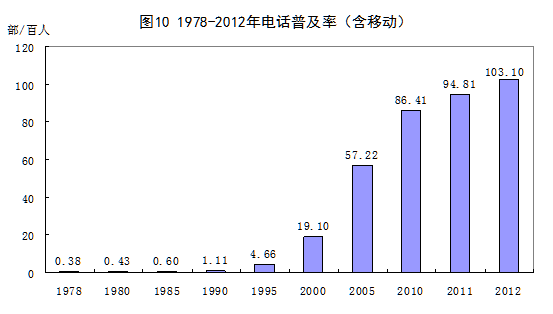 郵電通信業(yè)突飛猛進(jìn)。35年來,我國郵電通信業(yè)規(guī)模不斷擴大,服務(wù)種類不斷豐富,推動我國信息化水平不斷提高。郵政營業(yè)網(wǎng)點由1978年的5.0萬處擴張到2012年的9.6萬處,增長92.6%;郵路總長度由1985年的142萬公里提高到586萬公里,增長3.1倍;2012年,全國通郵的行政村比重達(dá)到99.1%。固定長途電話交換機容量由1978年的0.2萬路端提高到2012年的1580萬路端,增長8479倍;局用交換機容量由406萬門提高到43749萬門,增長106.8倍。固定電話用戶由192.5萬戶提高到2.8億戶,增長143.5倍;電話普及率由1978年的每百人0.38部提高到2012年的每百人103.10部;移動電話業(yè)務(wù)從無到有,手機已由上世紀(jì)九十年代的奢侈品變?yōu)楝F(xiàn)在的生活必需品,2012年普及率達(dá)到每百人82.50部,幾乎達(dá)到了所有成年人人手一部的水平;ヂ(lián)網(wǎng)設(shè)施迅猛發(fā)展,互聯(lián)網(wǎng)普及率由2002年的4.6%迅速提高到2012年的42.1%。