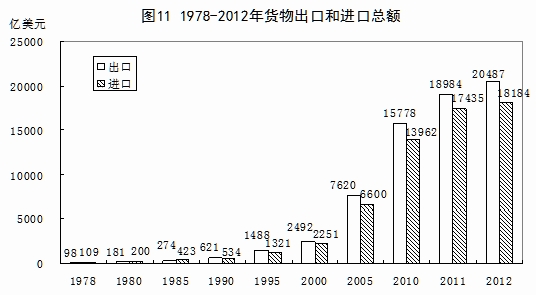 對外貿(mào)易總量不斷攀升。改革開放初期,我國對外經(jīng)濟交流活動十分有限,再加上國內(nèi)市場化水平不高,造成了與國際市場相對隔絕的狀態(tài)。1978年,我國貨物進(jìn)出口總額只有206億美元,世界排名第29位,1988年突破了1000億美元,1994年突破了2000億美元,1997年突破了3000億美元,2004年又突破了1萬億美元大關(guān),2012年,貨物進(jìn)出口總額已達(dá)到38671億美元,比1978年增長186倍,年均增長16.6%,僅次于美國,位居世界第二位;貨物出口總額20487億美元,增長209倍,年均增長17.0%,居世界第一位;貨物進(jìn)口總額18184億美元,增長166倍,年均增長16.2%,居世界第二位。2012年,我國貨物出口總額和進(jìn)口總額分別占世界的11.2%和9.8%。