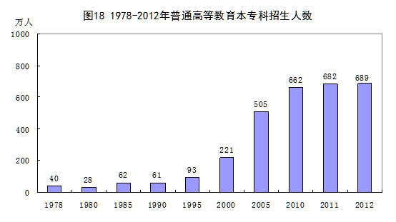 教育事業(yè)成績顯著。30多年來,黨中央、國務(wù)院堅持教育優(yōu)先發(fā)展的戰(zhàn)略,不斷加大教育投入力度,深化教育領(lǐng)域綜合改革,大力促進(jìn)教育公平,取得了一系列成績。教育普及程度明顯提高,城鄉(xiāng)免費九年義務(wù)教育全面實現(xiàn)。國民受教育程度大幅提升。6歲及以上人口平均受教育年限由1982年的5.2年提高到2012年的8.9年。2012年,普通高等教育本?普猩藬(shù)689萬人,比1978年增長16.1倍;在校生2391萬人,增長26.9倍;畢業(yè)生625萬人,增長36.9倍,較好地滿足了經(jīng)濟社會發(fā)展對各類人才的需求。