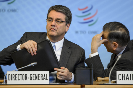 世界貿(mào)易組織總干事羅伯托·阿澤維多(左)26日表示,近期在瑞士日內(nèi)瓦舉行的密集貿(mào)易談判,雖然已在困難重重的諸多領(lǐng)域取得進(jìn)展,但仍未能達(dá)成最終的全球貿(mào)易協(xié)議。