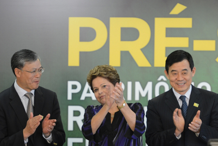 12月2日,在巴西首都巴西利亞,巴西總統(tǒng)羅塞夫(中)與中海油總裁李凡榮(左)和中石油副總裁薄啟亮(右)出席里貝拉海上油田開采合同簽字儀式。 巴西總統(tǒng)羅塞夫當日主持了里貝拉深海油田開采合同的簽字儀式。今年10月21日,在巴西政府組織的招標活動中,由巴西石油公司、荷蘭殼牌、法國道達爾以及中石油、中海油組成的國際財團作為唯一投標方中標,獲得了有效期為35年的開采權。在該國際財團中,中石油與中海油各占有10%的股權。