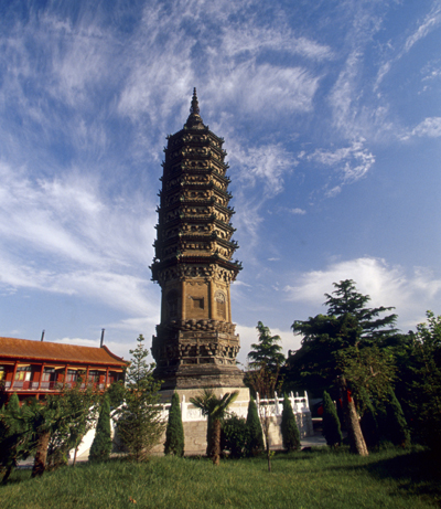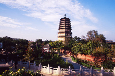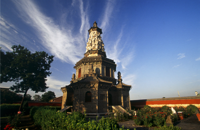 華塔原名多寶塔,始建于唐,高33.35米,矗立在廣惠寺內(nèi)。華塔由主塔和四小塔組成,主塔底層四隅各附建一座扁六邊形亭狀小塔,小塔環(huán)抱主塔,高低錯(cuò)落,主次相依,精巧華麗,壯觀(guān)秀逸。其奇特的平面布局是全國(guó)現(xiàn)存為數(shù)不多的其他花塔所不能比擬的,堪稱(chēng)我國(guó)絕無(wú)僅有的稀世珍寶。