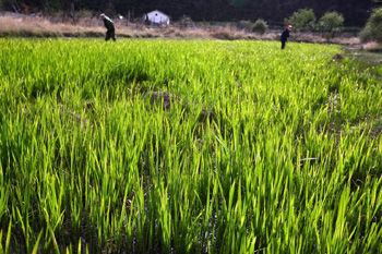 工人在藥材種植基地藏菖蒲試驗(yàn)田里工作 |