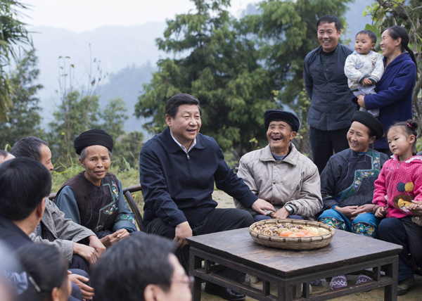 2013年11月3日至5日,中共中央總書記、國家主席、中央軍委主席習近平在湖南考察。這是3日下午,習近平在湘西土家族苗族自治州花垣縣排碧鄉(xiāng)十八洞村同村干部和村民座談。新華社記者 王曄 攝