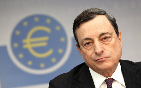 歐洲央行6日宣布,維持當(dāng)前利率政策不變,主導(dǎo)利率依舊保持在0.25%之上。同時(shí),英國央行(英格蘭銀行)宣布,維持當(dāng)前貨幣政策不變,基準(zhǔn)利率仍為0.50%水平,購債規(guī)模為3750億英鎊(約6130億美元)。 圖為歐洲央行行長德拉吉在當(dāng)日舉行的發(fā)布會(huì)上表示,歐元區(qū)并未處于通縮當(dāng)中,但歐洲央行會(huì)對(duì)物價(jià)持續(xù)走低保持警惕。