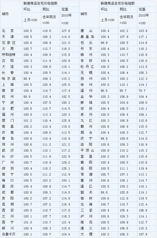 表:2014年1月70個大中城市新建商品住宅價格指數(shù)