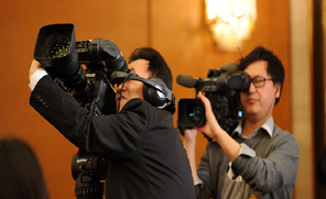 3月2日,全國政協十二屆二次會議新聞發(fā)布會在人民大會堂一層新聞發(fā)布廳舉行,現場攝像記者正在調試設備。