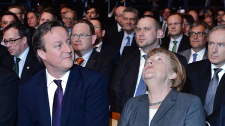 3月9日,在德國漢諾威,德國總理默克爾(前右)和英國首相卡梅倫(前左)出席漢諾威IT展開幕式。