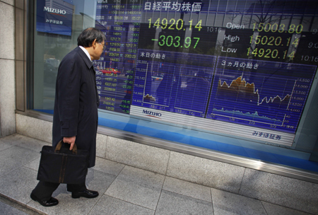 受外部市場普遍低迷、日元對美元匯率明顯回漲以及經(jīng)濟(jì)數(shù)據(jù)利空等多重因素打壓,當(dāng)日東京股市大幅走跌,日經(jīng)225種股票平均價(jià)格指數(shù)收盤時(shí)比前一個(gè)交易日下跌2.59%,失守15000點(diǎn)大關(guān)。圖為在日本首都東京,一名男子觀看股指電子顯示屏。