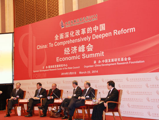 “中國發(fā)展高層論壇2014”于3月22日-24日在釣魚臺舉行。上圖為投資自由化與企業(yè)走向世界討論。