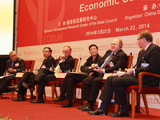 “中國發(fā)展高層論壇2014”于3月22日-24日在釣魚臺舉行。上圖為投資環(huán)境與政府職能轉變討論。