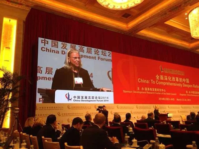 羅睿蘭:各位早上好!尊敬的副部長,各位同事,非常高興能夠再次回到中國參加中國發(fā)展高層論壇,在過去兩天當(dāng)中我饒有興趣的傾聽了各位發(fā)言嘉賓的發(fā)言,正如張高麗副總理昨天所說的,對中國來說我們建立具有更加有序的競爭市場,同時他強調(diào)了中國作為世界上第二大經(jīng)濟(jì)體,一方面他要把這個國家建成一個經(jīng)濟(jì)大國,同時要成為一個由創(chuàng)新驅(qū)動的經(jīng)濟(jì)強國,他同時討論到了所謂產(chǎn)能過剩的問題,今天我也想做一些我的補充,在這個話題上我們做了很多的討論,比如說通過整合或者退出機制解決過;蛘咴黾有枨、提高效率,最后我也想可能是要通過增加需求解決這些產(chǎn)能過剩的問題,我同意這些觀點,但是我想建議的是,所有的對于這些行業(yè)的影響,歸根到底還是落實到如何提高,或者產(chǎn)業(yè)鏈上向高端發(fā)展,如何在產(chǎn)業(yè)鏈上向高端延伸?我覺得主要是讓工業(yè)化和信息化進(jìn)行高度的銜接,也就意味著我們必須會面對的,或者必須將我們的產(chǎn)業(yè)化向上延伸的工作,與工業(yè)化和信息化相互銜接起來,在十八屆三中全會當(dāng)中也談到了對下一代的信息技術(shù)的重視,那么蘇部長同時討論到了或者談到了工業(yè)化和信息化這兩個話題,對中國也是中國經(jīng)濟(jì)戰(zhàn)略當(dāng)中重要的部分。我完全贊成這種觀點,一方面我們已經(jīng)了解到無論是傳統(tǒng)的還是新興的產(chǎn)業(yè)都需要利用科技朝著價值鏈的高端進(jìn)行延伸。