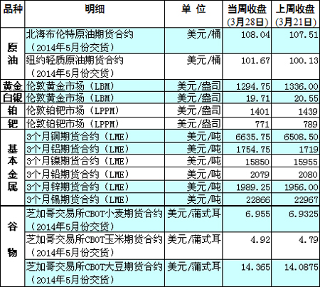 國際大宗商品期貨價(jià)格明細(xì)表[2014-3-31]