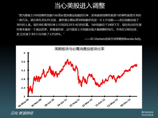 “圖為摩根士丹利周期性指數(shù)與標(biāo)普必需消費品指數(shù)的比率,是我觀察周期性股票與防御性股票關(guān)系的一種方法。該比率在2012年見底,最終預(yù)示著標(biāo)普500指數(shù)仍有進(jìn)一步上升動能——此后指數(shù)出現(xiàn)了36%的上漲,F(xiàn)在我們看到比率上升到2011年5-6月的位置。當(dāng)時指數(shù)位于1400下方,現(xiàn)在的點位在那時看來像是一個遙遠(yuǎn)的夢。更重要的是,這可能是上次指數(shù)出現(xiàn)大幅調(diào)整的地方。市場在1360見頂,然后在接下來5個月內(nèi)跌了大約20%!薄狪G