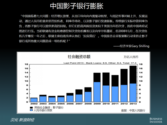 “中國面臨著七大問題:經(jīng)濟增長放緩、從出口導(dǎo)向向內(nèi)需驅(qū)動轉(zhuǎn)型、與周邊軍事對峙上升、反腐運動、通過人民幣貶值來懲罰投機者、利率市場化,以及影子銀行快速膨脹。傳統(tǒng)銀行實際存款利率為負(fù),而影子銀行可以提供更高的回報。但它們的高風(fēng)險投資類似于美國當(dāng)年的次貸,因此中國政府試圖進(jìn)行打壓。當(dāng)初聯(lián)儲有資金和意愿控制次貸危機爆發(fā)以及向華爾街蔓延,但2008年1月,在次貸危機幾乎爆發(fā)一年之后,聯(lián)儲主席伯南克承認(rèn)他們‘反應(yīng)滯后’。中國是否會采取果斷行動來防止影子銀行或其他重大問題造成一場危機呢?”——經(jīng)濟學(xué)家Gary