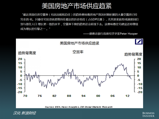 “最近美國住房空置率(包括出租和自住)的趨勢意味著房地產(chǎn)泡沫時期積累的大量空置房已經(jīng)完全消化。只要住宅投資依然維持在最近的歷史低位(占GDP比重),尤其是家庭形成速度回歸到與潛在人口增長更一致的水平,空置率下降的趨勢還會延續(xù)下去。這意味著住宅建設(shè)還將繼續(xù)成為增長的引擎之一!薄乱庵俱y行首席經(jīng)濟學(xué)家Peter