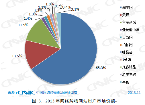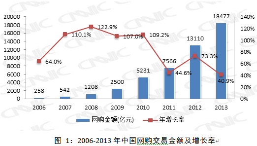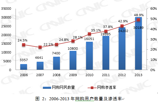 2014年4月,中國(guó)互聯(lián)網(wǎng)絡(luò)信息中心CNNIC發(fā)布了《2013年中國(guó)網(wǎng)絡(luò)購(gòu)物市場(chǎng)研究報(bào)告》。報(bào)告顯示,2013年網(wǎng)絡(luò)購(gòu)物市場(chǎng)穩(wěn)步快速向前發(fā)展,彰