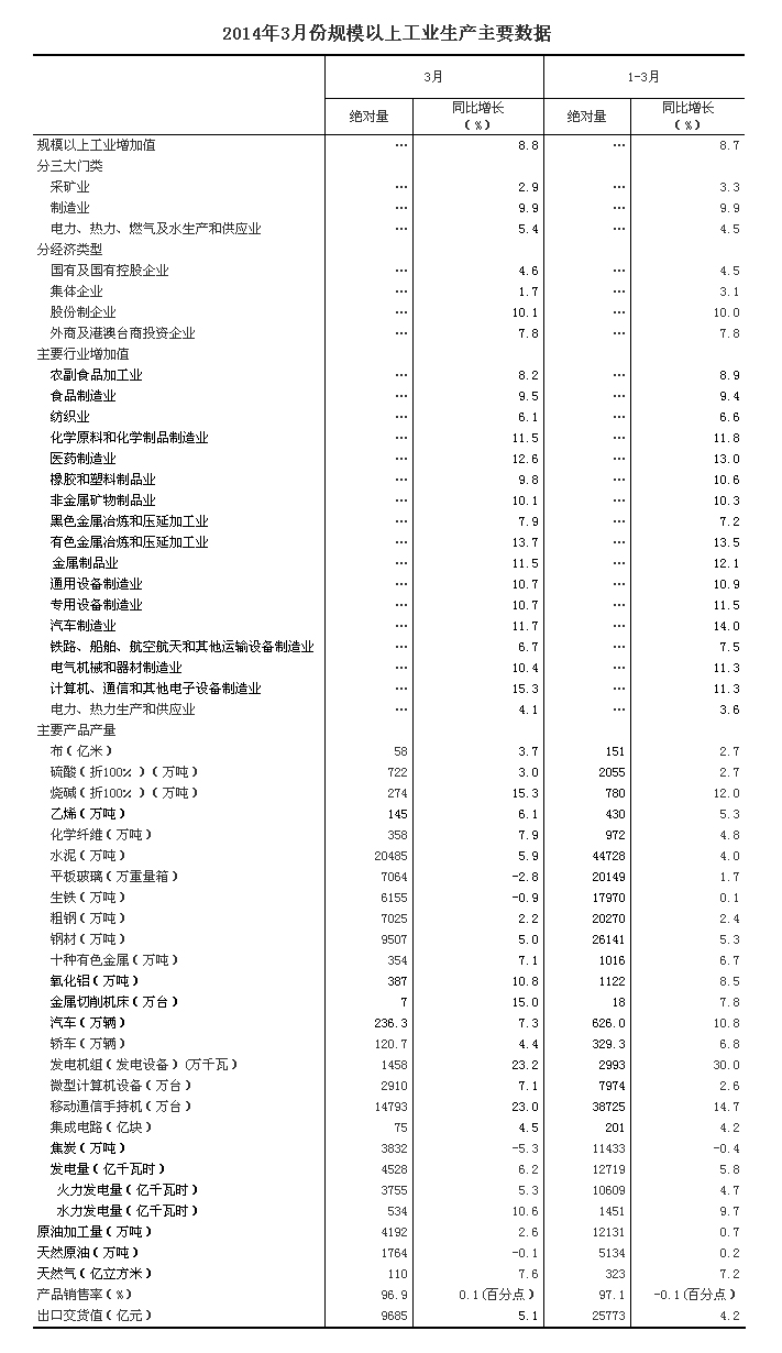 2014年3月份,規(guī)模以上工業(yè)增加值同比實(shí)際增長(zhǎng)8.8%(以下增加值增速均為扣除價(jià)格因素的實(shí)際增長(zhǎng)率),比1-2月份加快0.2個(gè)百分點(diǎn)。從環(huán)比看,3月份比上月增長(zhǎng)0.81%。一季度,規(guī)模以上工業(yè)增加值同比增長(zhǎng)8.7%。