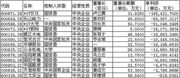 此外,從企業(yè)盈利角度看,有13家企業(yè)的董事長在企業(yè)處于虧損狀態(tài)下依然領(lǐng)有薪酬。如眾合機電去年虧損1.48億,其董事長年薪為96萬元,其年薪在虧損央企中拔得頭籌。